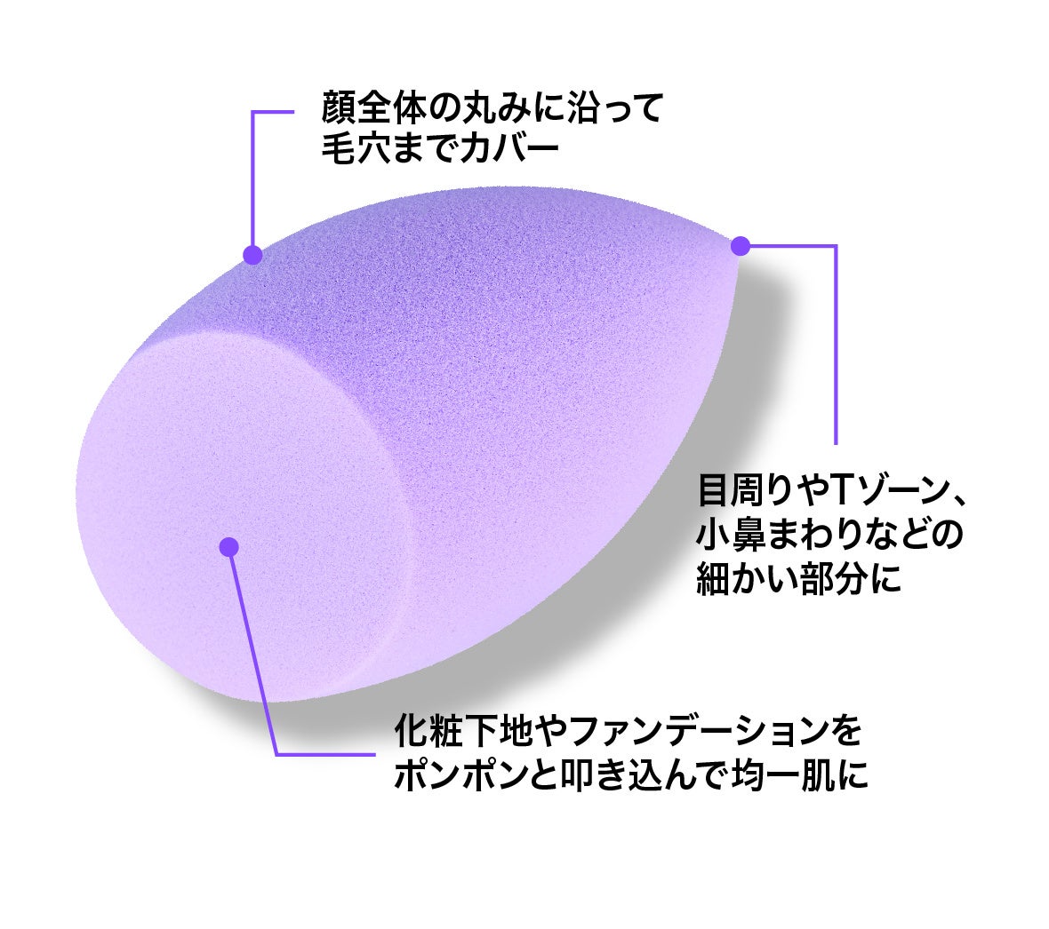 *スポンジの吸収性が高いため、化粧下地、リキッド・クリーム、コンシーラーは直接スポンジにつけず、指でお肌にのせてからスポンジを使ってなじませてください。