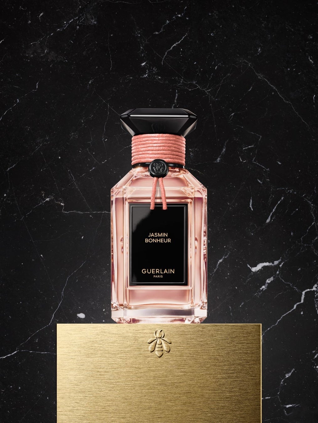 〈ジャスミン ボヌール〉は、喜び溢れる明るい色彩を纏ったジャスミンの香り。アプリコットノートによる眩いオレンジ、パウダリーなアイリスによる鮮やかなパープル、ローズが香る柔らかなピンク。画家アンリ・マティスの色彩豊かなパレットにインスパイアされたゲランの調香師は、心躍る色に彩られたカラフルなジャスミンを香りで表現しました。