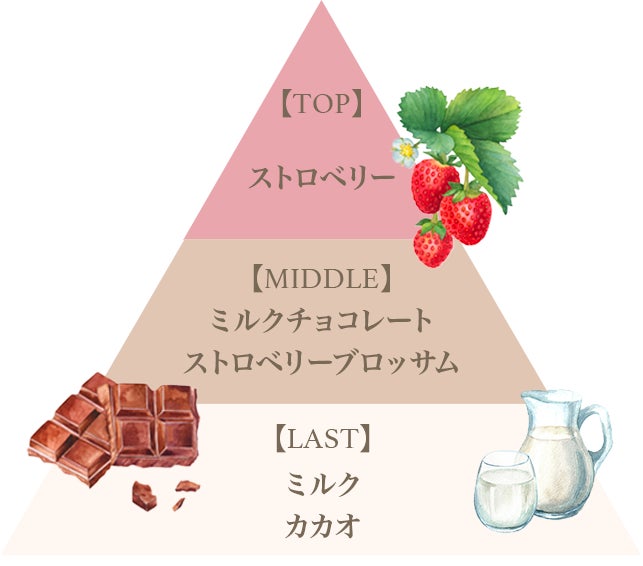 「イチゴショコラ」は、ぎゅっと甘さがつまった完熟なイチゴとコクのあるミルクチョコレートが溶け合う、濃密でミルキーなイチゴチョコレートの香りです。