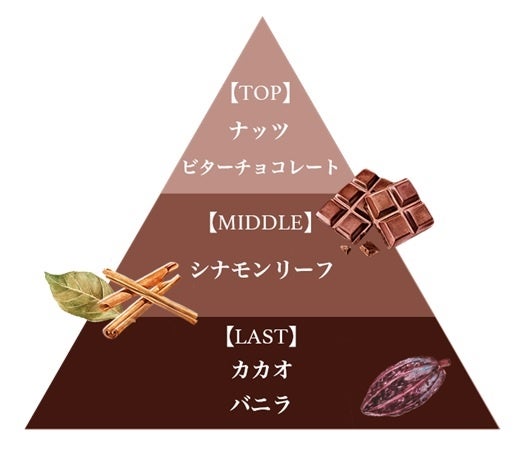 「ココアショコラ」は、コクのあるビターチョコレートにスパイシーなシナモンリーフ、芳醇なカカオが重なり合う、まるで本物のチョコレートのような濃厚ですこし大人なチョコレートの香りです。
