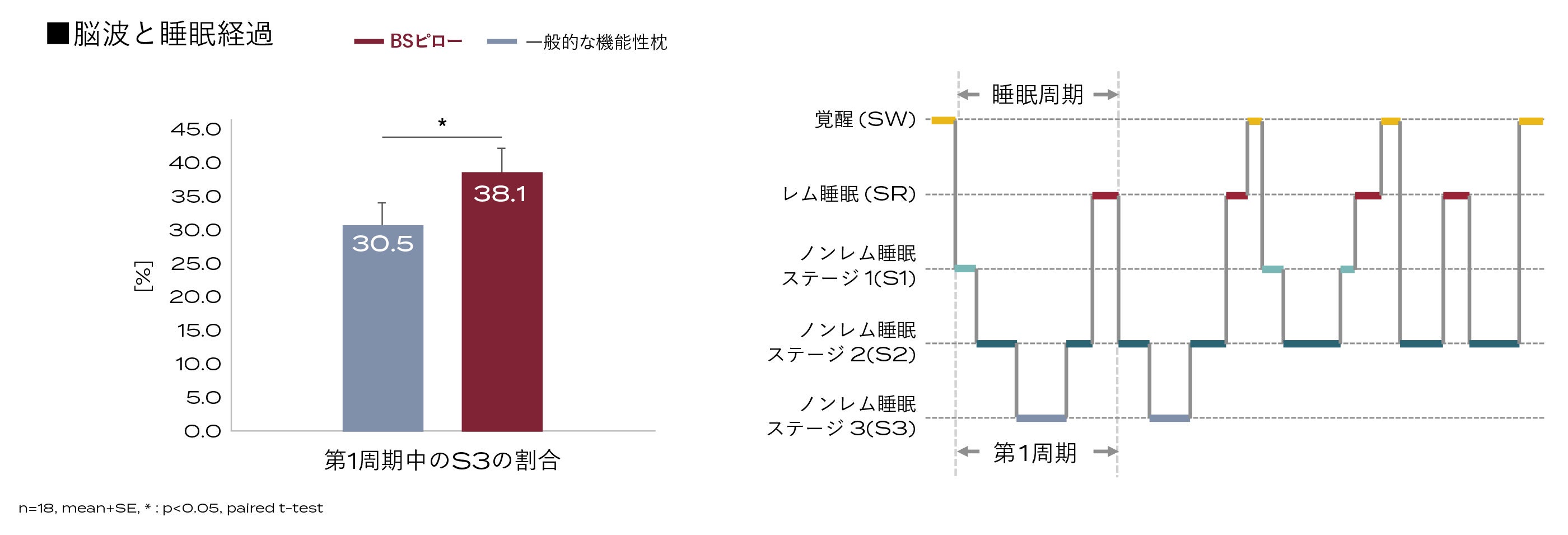 睡眠には深い眠りの「ノンレム睡眠」と浅い眠りの「レム睡眠」があり、それらが交互に繰り返されることで構成されています。人は一般的に一晩の睡眠でレム睡眠とノンレム睡眠を約90分周期で4~5回繰り返します。本検証では、脳波計を用いて睡眠中の睡眠ステージの判定を行いました。その結果、睡眠の質を左右する第1周期(「黄金の90分」)における最も深い睡眠(ノンレム睡眠のステージ3(以下、「S3」))の割合は、一般的な機能性枕の30.5±3.7%に比べて、ブレインスリープ ピローでは38.1±3.8%と有意に増加しました。