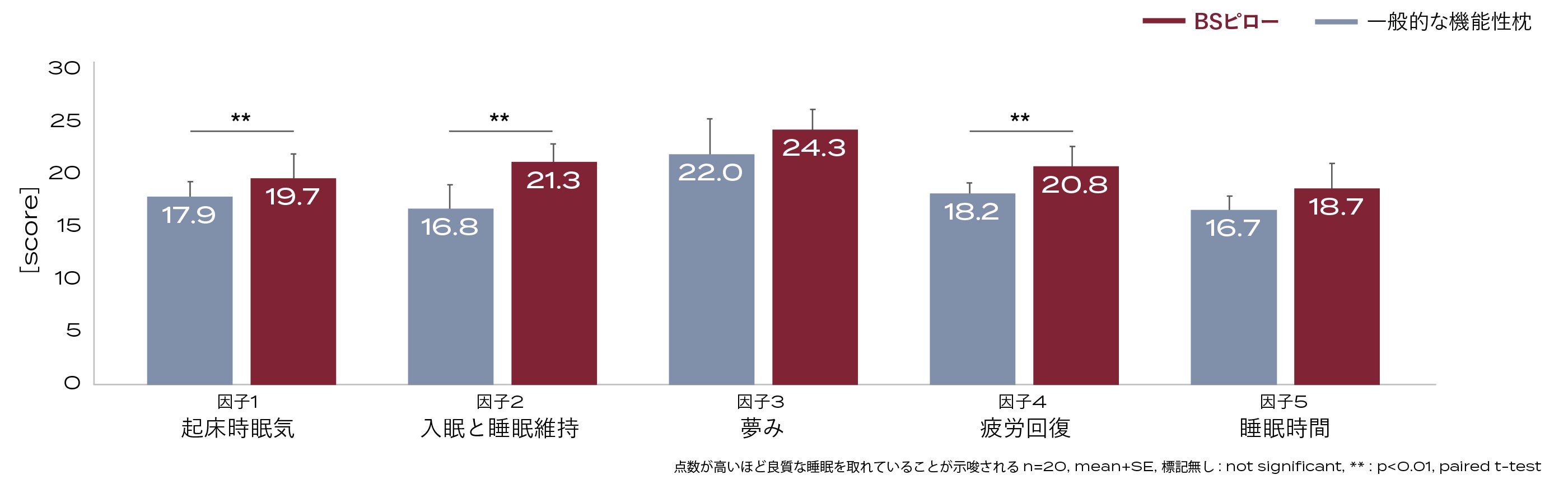 起床時の自身の睡眠を評価する心理尺度であるOSA睡眠調査票を用いたアンケート評価で、睡眠に関する主観的評価を比較しました。以下の5つの睡眠因子のうち、起床時眠気、入眠と睡眠維持、疲労回復においてブレインスリープ ピローの得点が一般的な機能性枕と比べて、有意に高くなりました。