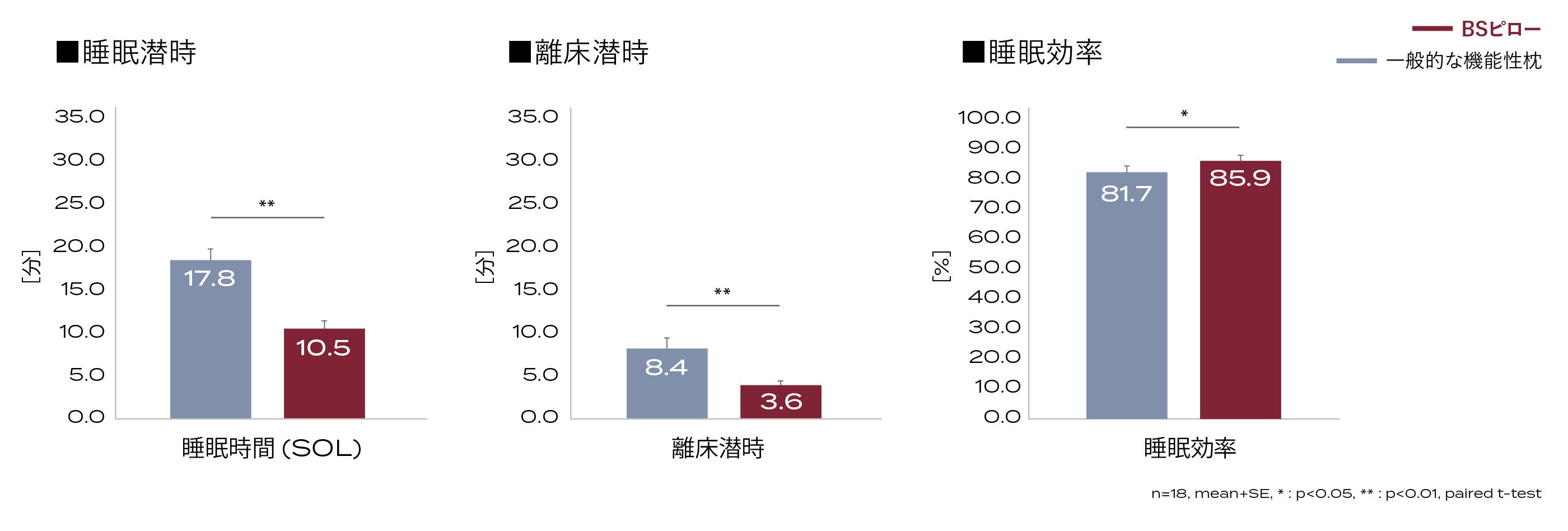 寝つきの良さを示す指標である睡眠潜時<就床から入眠までに要した時間>は、一般的な機能性枕の17.8±1.9分に比べて、ブレインスリープ ピローでは10.5±1.2分と有意に減少しました。また、目覚めの良さを示す指標である離床潜時<最終覚醒から起床までの時間>についても、一般的な機能性枕の8.4±0.9分に比べて、ブレインスリープ ピローでは3.6±0.5分と有意に減少しました。また、睡眠潜時と離床潜時が短縮したことに起因して、睡眠効率<ベッドにいた時間のうち実際に眠っていた時間の割合>も、一般的な機能性枕の81.7±2.3%に比べて、ブレインスリープ ピローでは85.9±1.9%と有意に改善しました。