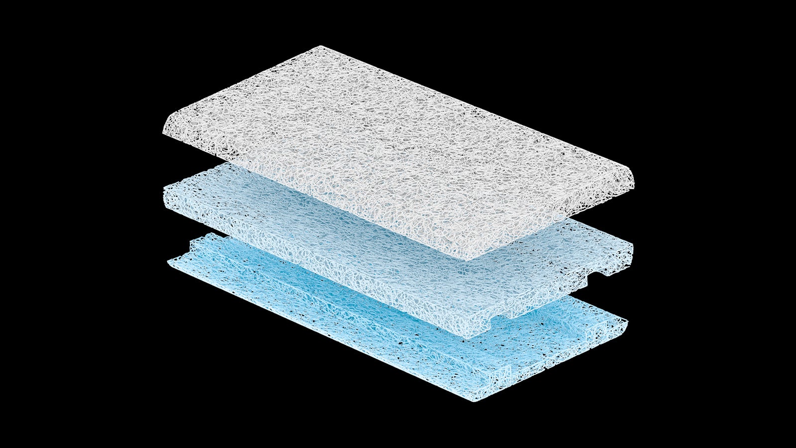 頭の大きさや重さに合わせてフィットする“アジャスト層”、頭や首をしっかり支える“サポート層”下からも空気が抜ける“ベース層”と、3種の繊維が異なる樹脂が重なった理にかなった構造になっています。首元は沈み込みやすいやわらかさに、両端は少し硬く、横向きに寝てもしっかりフィットし、寝返りが打ちやすく仕上げています。