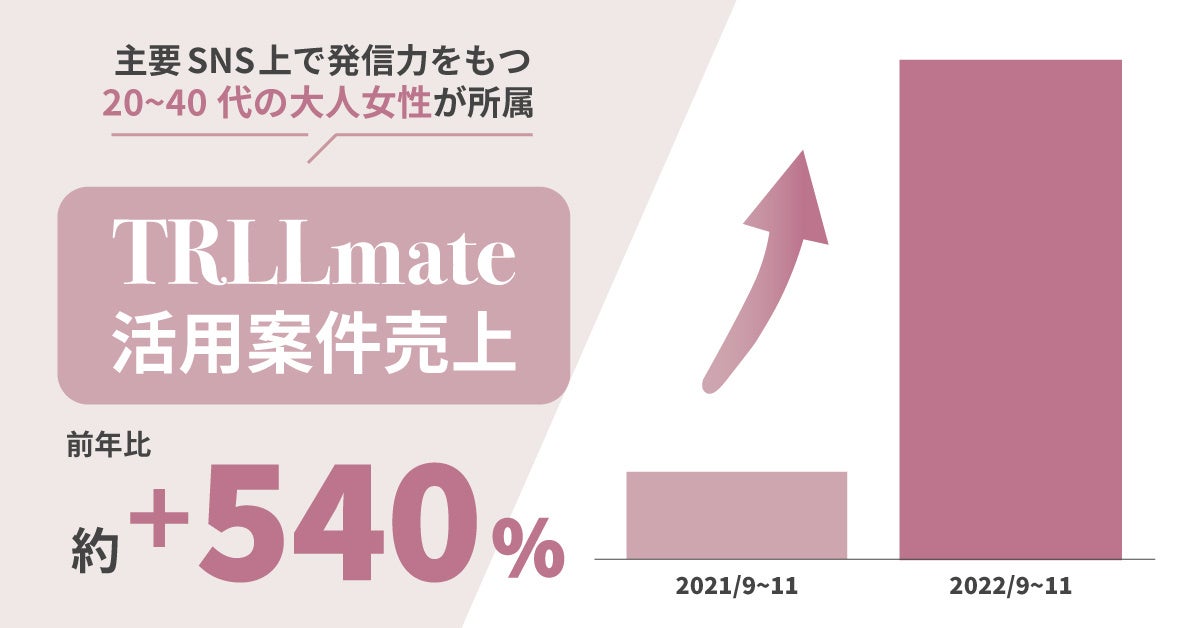 月間利用者数5,500万人を誇る国内No.1のライフスタイルプラットフォーム「TRILL」は、2021年9月にインフルエンサー組織「TRILL mate」を立ち上げました。立ち上げから順調にインフルエンサー案件の売上を伸ばしており、2022年9月〜11月の売上は前年比約540%増加し、前年同期間の売上を大きく上回りました。