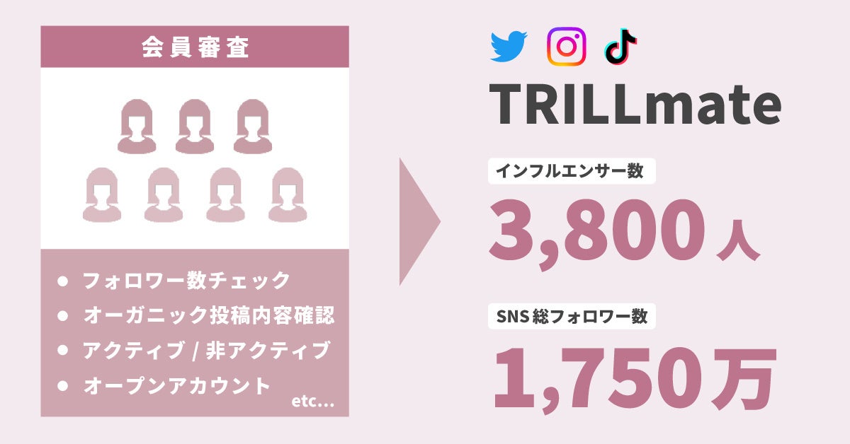 「TRILL mate」は会員審査制を導入しています。入会希望者のSNSアカウントフォロワー数、投稿数、投稿内容等を確認し、審査に合格したインフルエンサーのみ「TRILL mate」に参加することができます。美容・トレンドの情報感度が高く、自身でも積極的に発信を行っているため、高い投稿率と投稿クオリティを実現します。