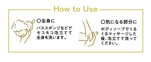 全身を洗う際はバススポンジなどでモコモコ泡立てて、カサつきが気になる部分にはボディーソープでくるくるマッサージ。その後は全身洗って流します。