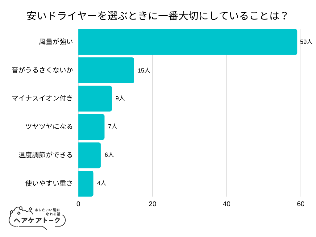 「安いドライヤーを選ぶときに一番大切にしていることは?」とアンケート調査した結果、1位は『風量が強い』でした。