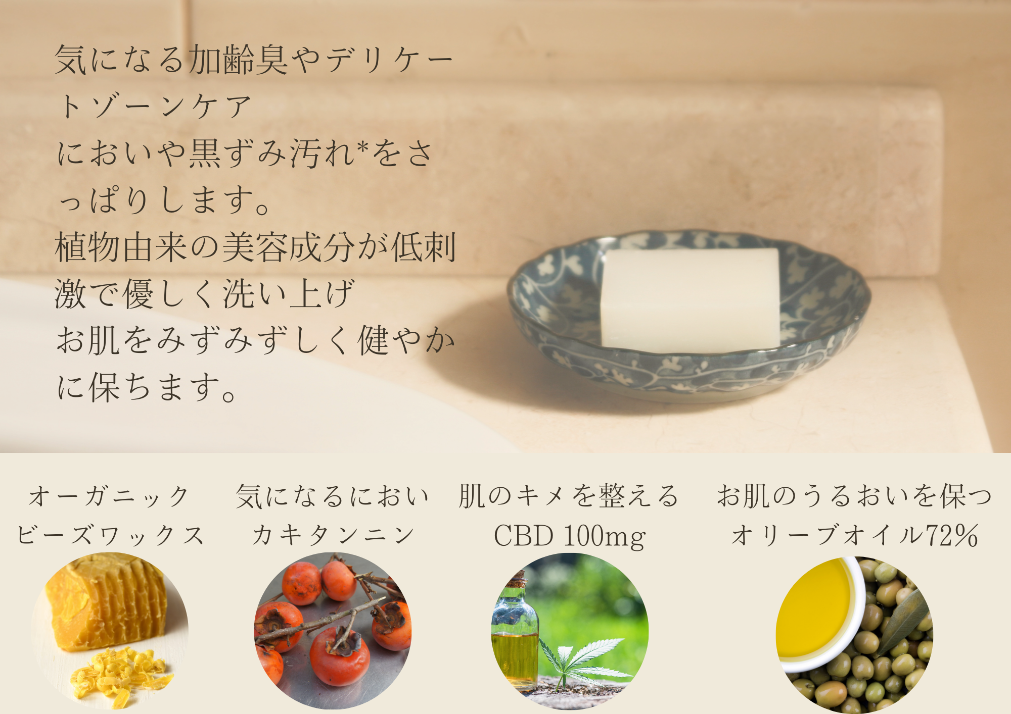 CBD100mgを配合し、オーガニックシアバターなどナチュラルな成分にこだわった無添加石鹸。