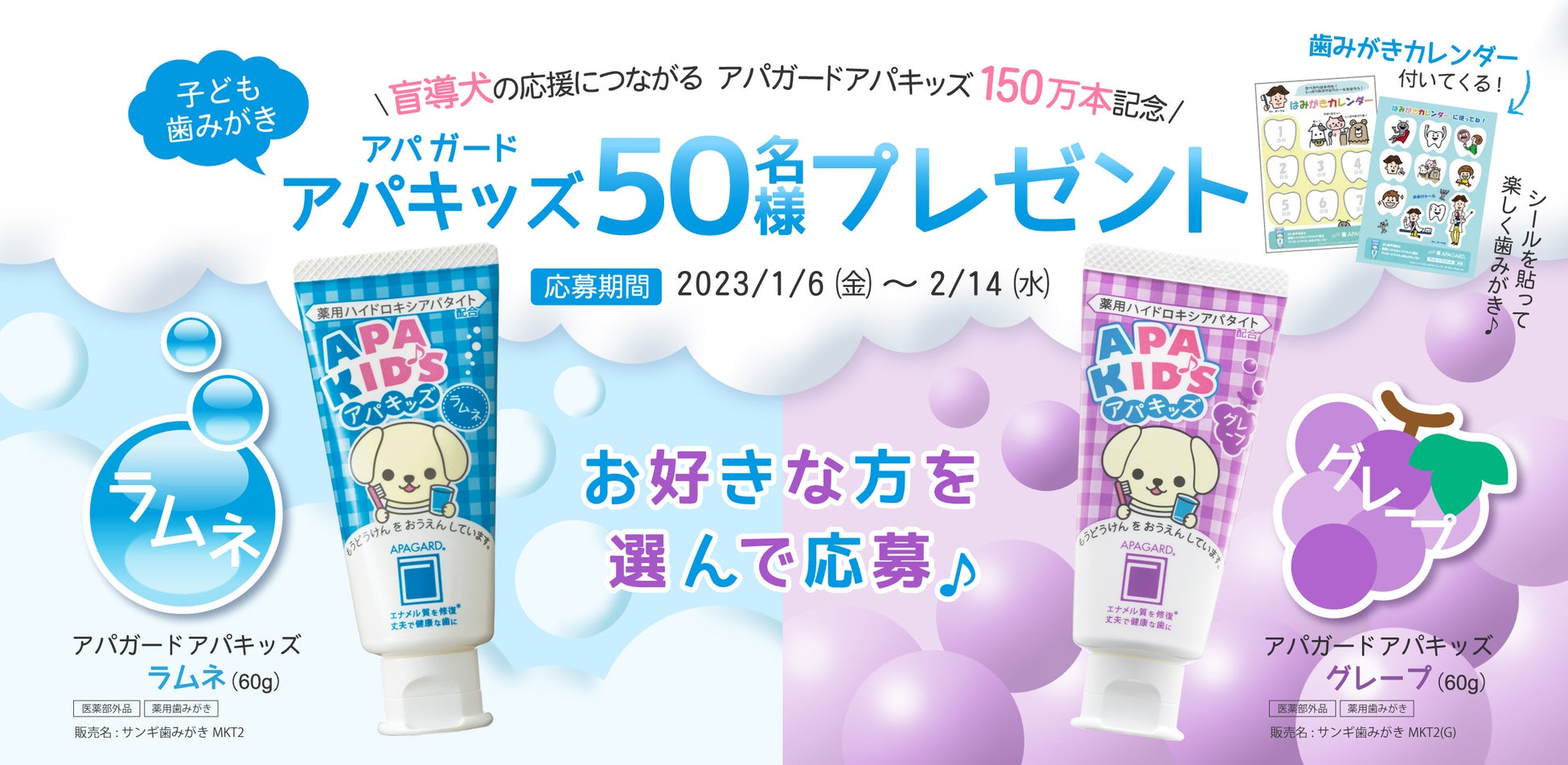 美白高機能歯みがき剤※ 1「アパガード」の開発・発売元である株式会社サンギ(本社:東京都中央区築地、代表取締役社長:ロズリン・ヘイマン)が発売する子ども歯みがき「アパガードアパキッズ」は、2022年12月で累計出荷本数150万本*に到達いたしました。本品の売上の一部は、盲導犬総合支援センターを通じ、補助犬及び障害者の社会参加の支援活動に役立てられ、盲導犬の応援につながる商品です。これを記念して、2023年1月6日~2月14日までプレゼントキャンペーンを実施いたします。