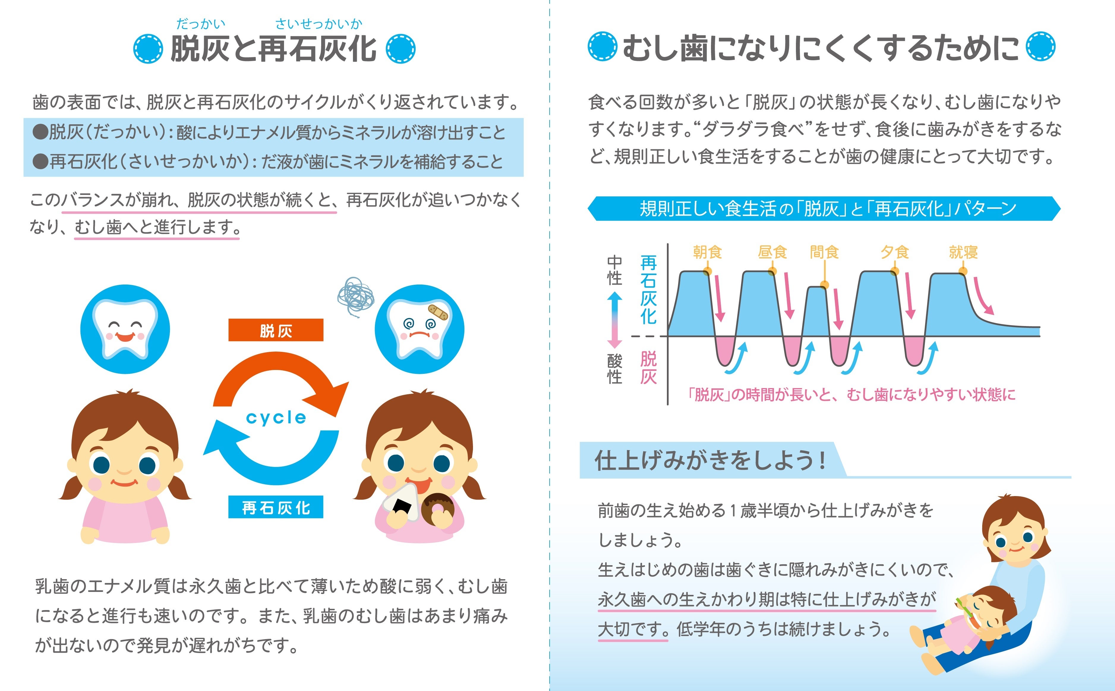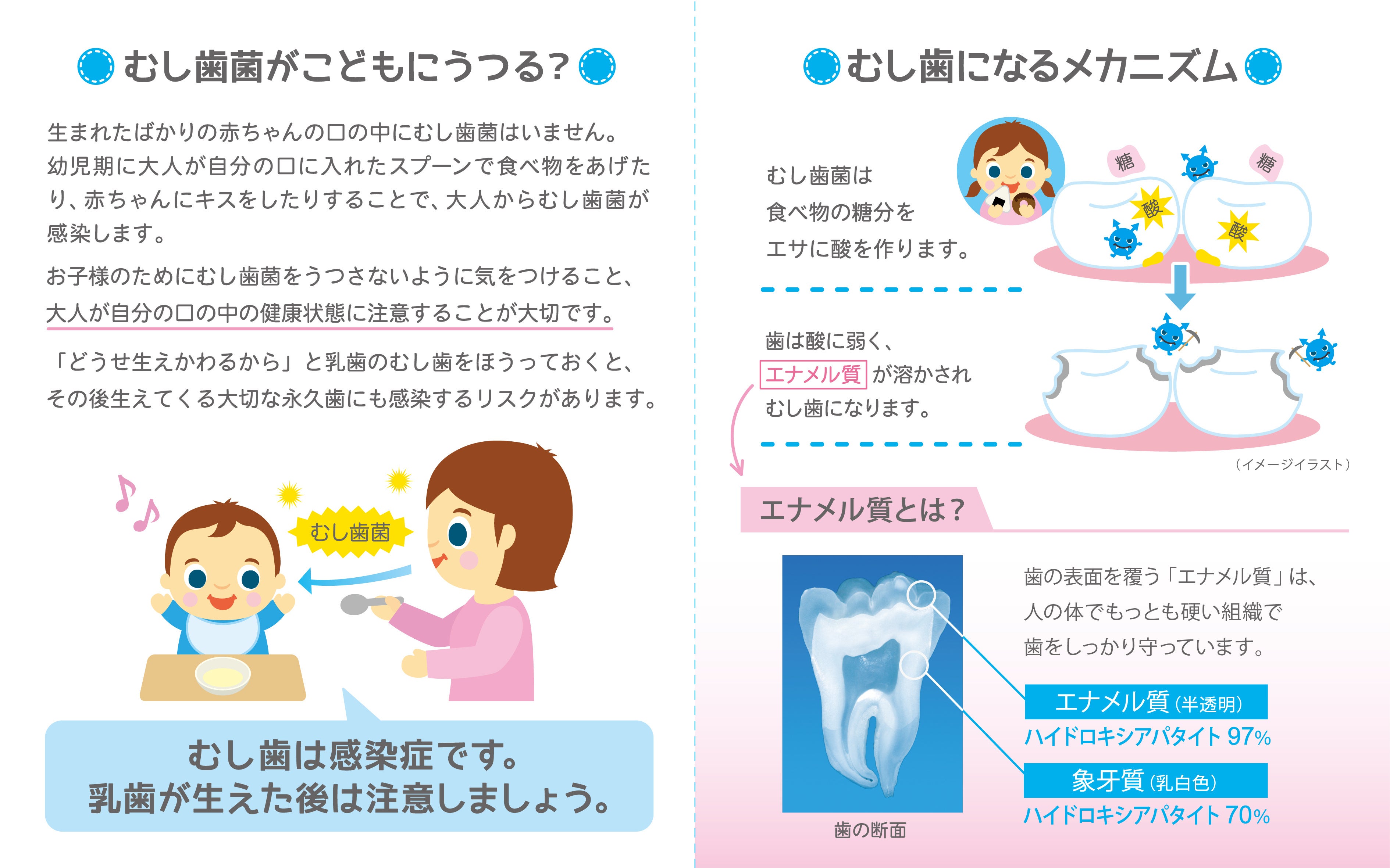 よく知られている「フッ素」は唾液による再石灰化を促しますが、歯とほぼ同じ成分※2の「薬用ハイドロキシアパタイト」は、成分自体が再石灰化します。 乳歯は特に、エナメル質が未成熟で薄く、ダメージを受けやすいので、一度むし歯になると急速に進行してしまいます。