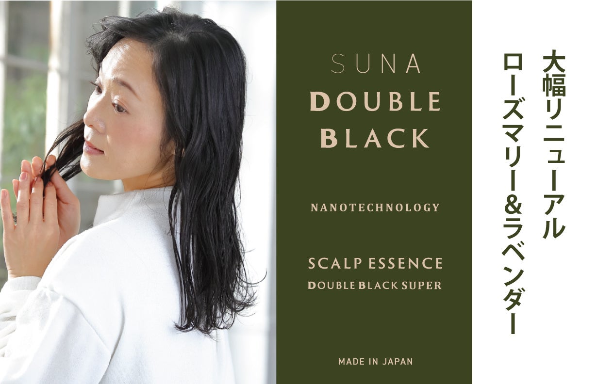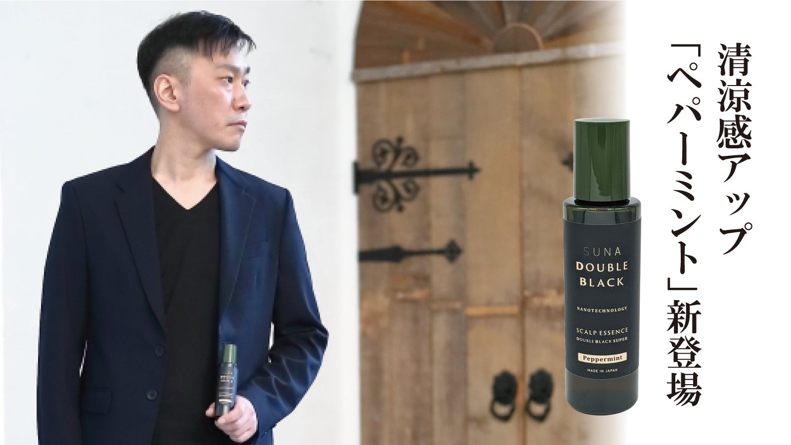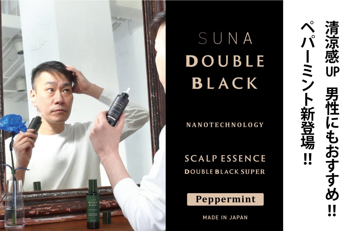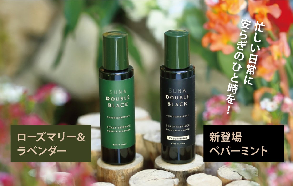 この度、ヘアケアで実績のある新成分「センブリエキス」を加えてパワーアップした新製品「SUNA スカルプエッセンス ダブルブラック スーパー」が登場しました。さらにご好評いただいております「ローズマリー&ラベンダー」の香りに加えて、新たに清涼感UP、男性にもおススメの「ペパーミント」が誕生しました。