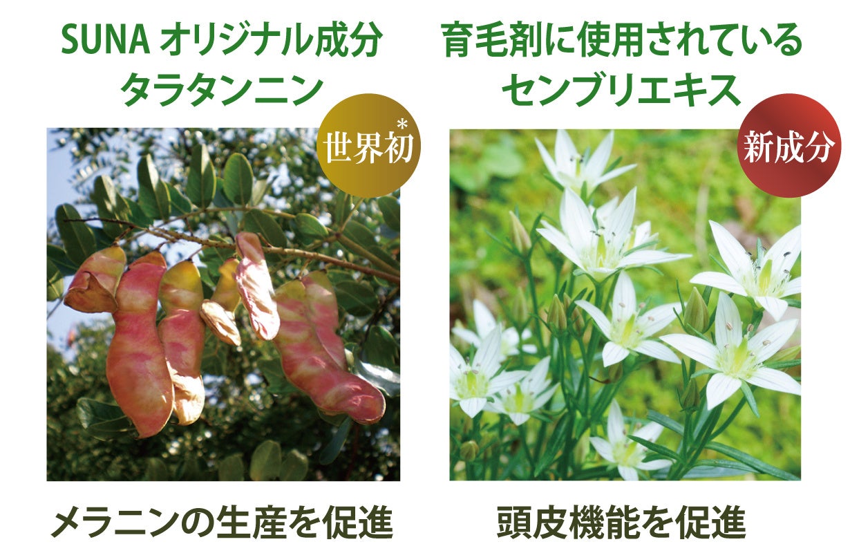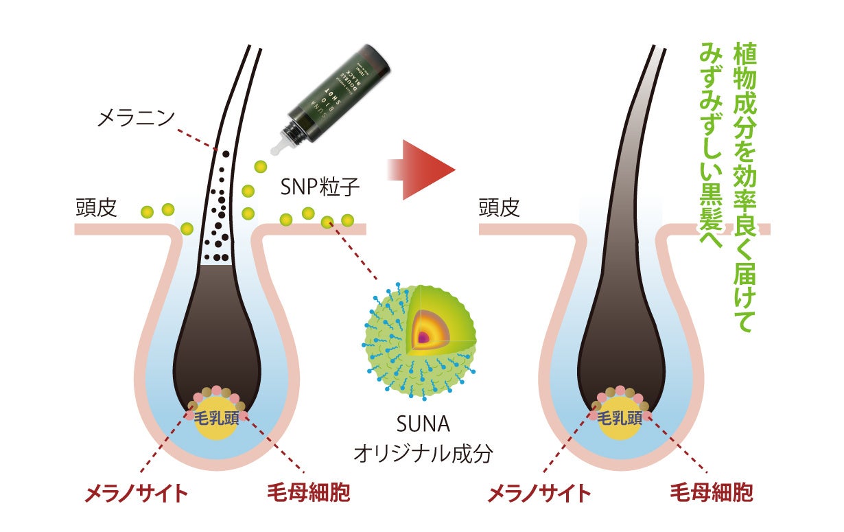 また、SUNA製品にはメラニンの生産を促進する効果があるオリジナル成分の「タラタンニン*」を配合し、SNP技術で有効成分を毛根までダイレクトに浸透・吸収させることを可能としました。