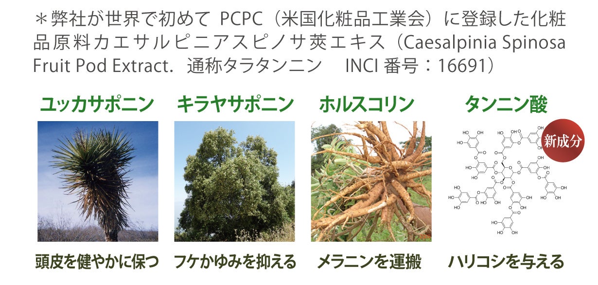 *タラタンニンとは:南米ペルーの固有種であるカエサルピニアスピノサの豆の莢より抽出されるポリフェノール成分(慣例名:タラタンニン)に、顕著な毛乳頭細胞増殖効果およびメラニン色素産生促進効果があることが検証されています。