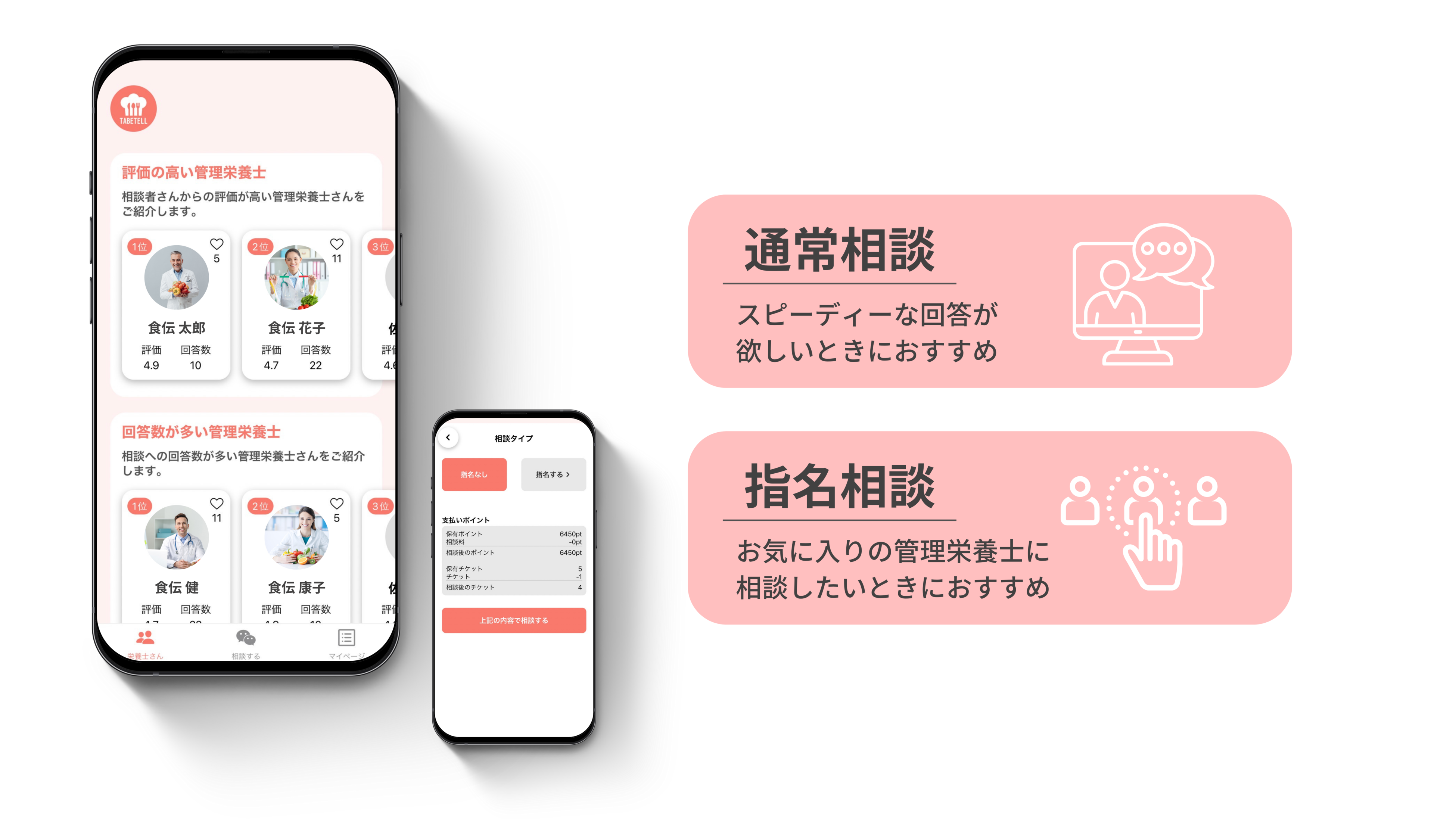 その時アクティブな管理栄養士が、相談に対して迅速に回答する「通常相談タイプ」と、お気に入りや気になる管理栄養士に直接相談できる「指名相談タイプ」です。