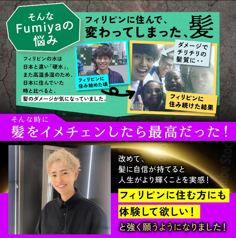 フィリピンに留学し、高温多湿に加え日本とは異なる硬水で髪の毛のダメージが気になり始めたそうです。