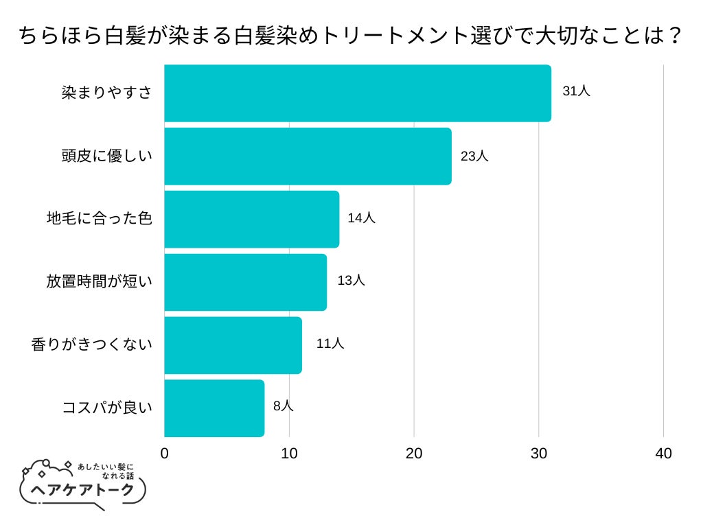 「ちらほら白髪が染まる白髪染めトリートメント選びで大切なことは?」とアンケート調査した結果、1位は『染まりやすさ』でした。