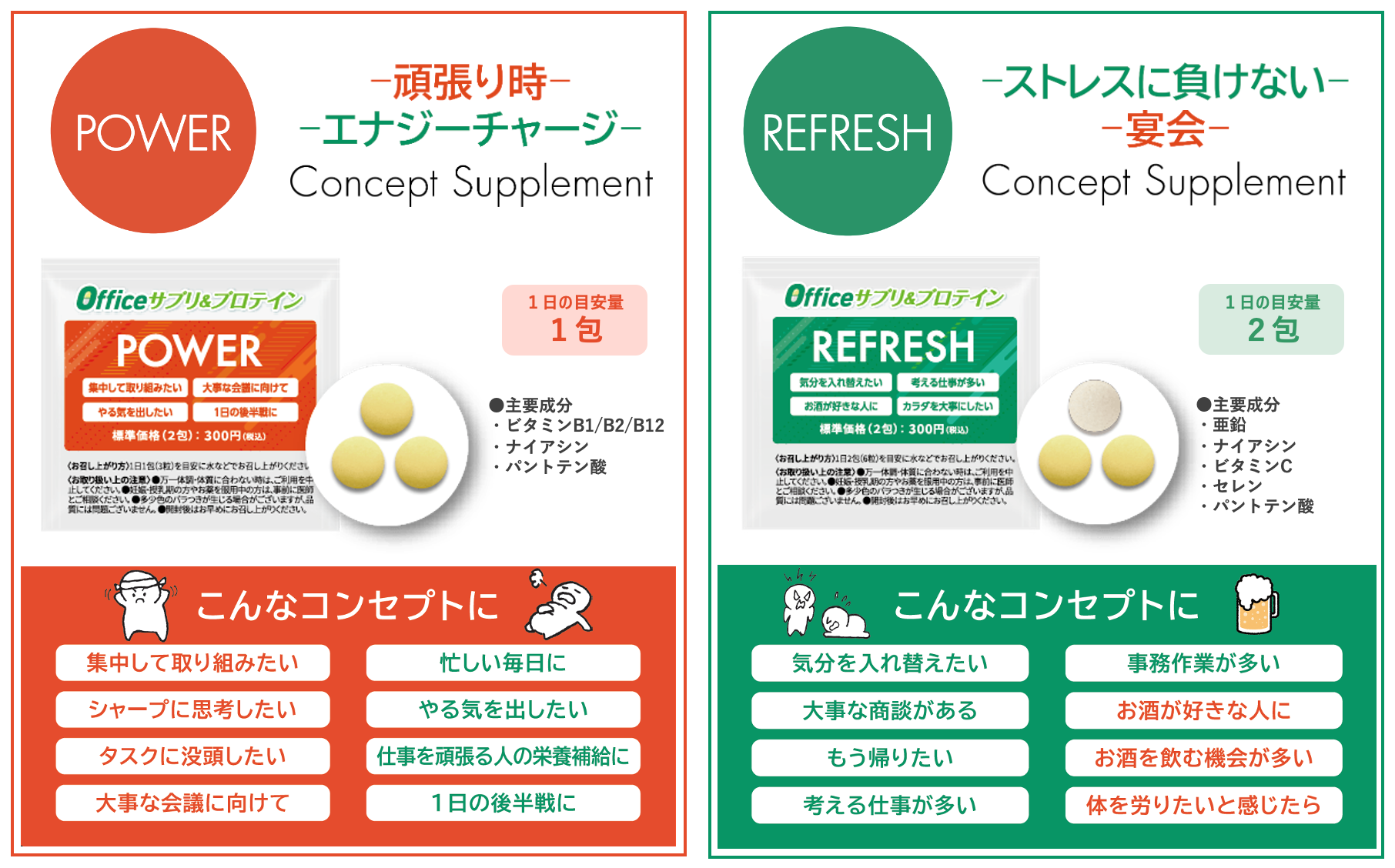 サプリメントは2種類をご用意。「大事な会議前」や「集中して取り組みたい」ときには『POWER』でエナジーチャージを、また「考える仕事が多い」、「気分を替えたい」ときや、「お酒が好きな人」には、『REFRESH』でリフレッシュがおすすめ。