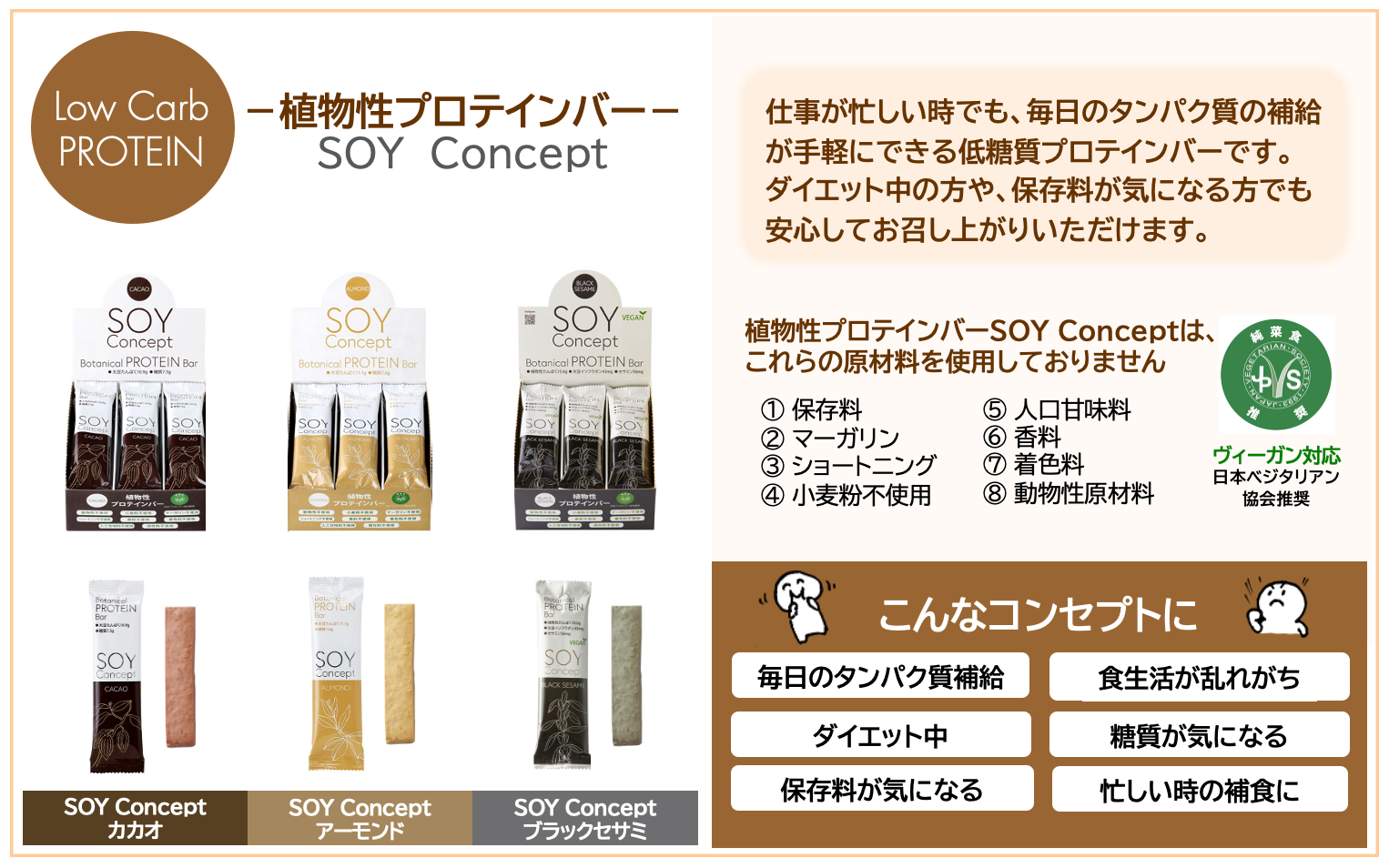 「タンパク質補給」や「忙しいときの補食」にしたいプロテインバーは植物性で、『カカオ』『アーモンド』『ブラックセサミ』の3種類をご用意。いずれもマーガリンやショートニング、保存料は不使用で、Officeの健康経営促進にお役立ていただけます。