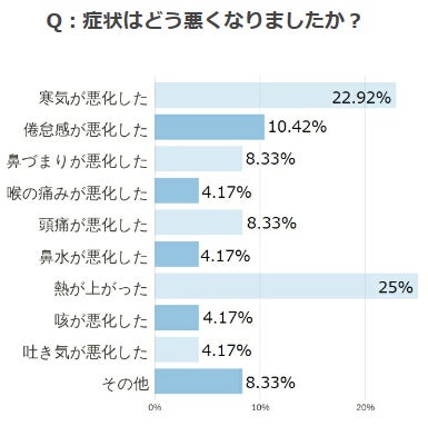 風邪のときの入浴後の症状については、“変わらない”という人が約半数であったものの、“良くなった”という割合が“悪くなった”という人の4倍の割合とのことで、大差がつきました。 では、それぞれ、具体的にどう症状が変わったのかを見てみます。