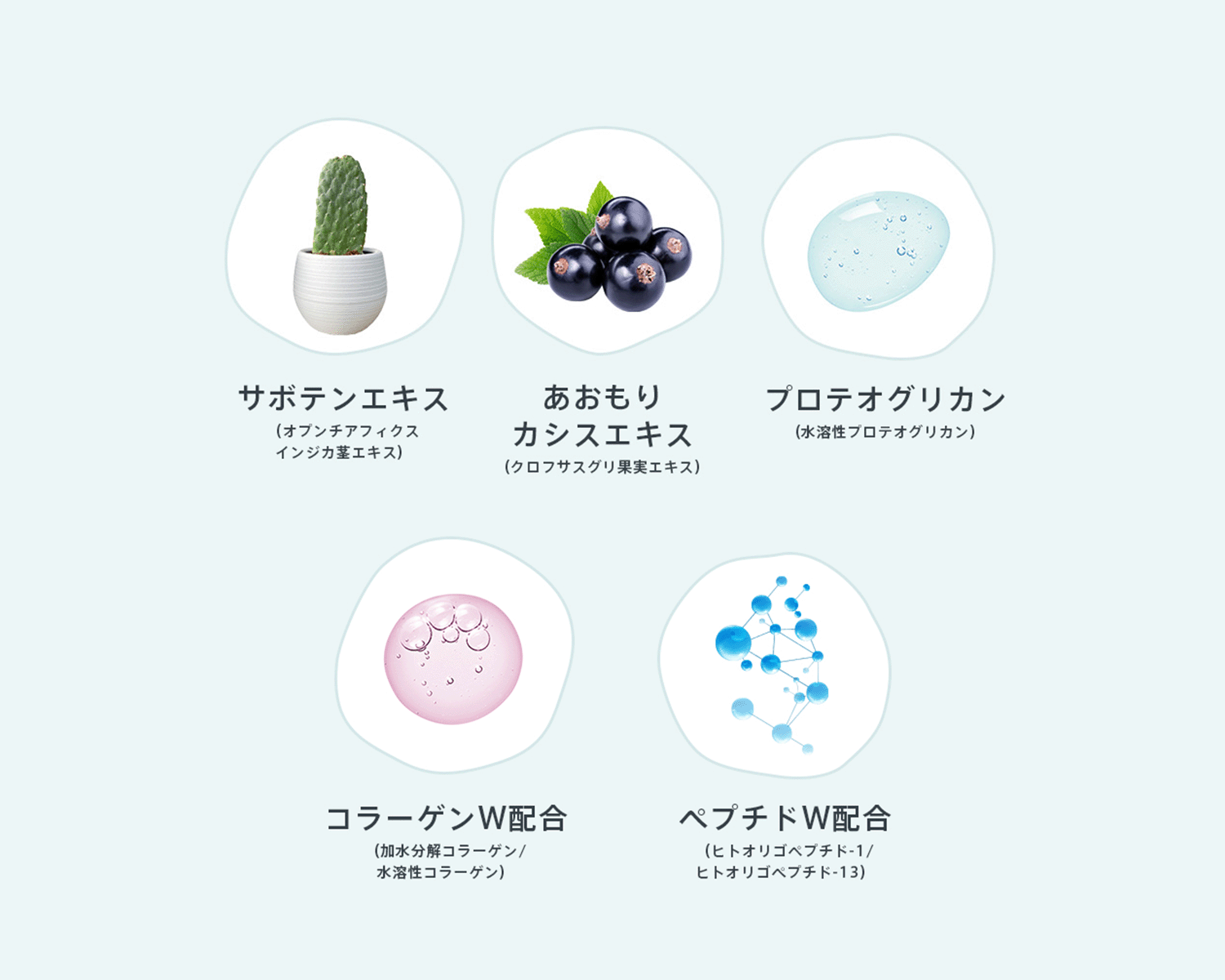 洗顔後のつっぱり感や乾燥の軽減のために保湿成分をたっぷり配合しました。過酷な砂漠を生き抜き、8~9割の水分を抱えるウチワサボテン由来エキス(エコサート認証済み)※3やプロテオグリカン※4が肌に潤いを与えます。コラーゲンとペプチドはそれぞれW配合※5し、洗顔後のもっちり感を追求しました。さらにカシスエキス※6が肌を引き締めます。