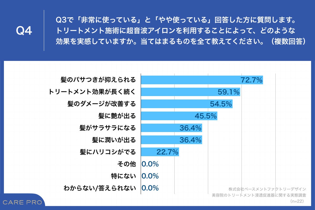 Q3で「非常に使っている」と「やや使っている」回答した方に、「Q4.トリートメント施術に超音波アイロンを利用することによって、どのような効果を実感していますか。当てはまるものを全て教えてください。(複数回答)」(n=22)と質問したところ、「髪のパサつきが抑えられる」が72.7%、「トリートメント効果が長く続く」が59.1%、「髪のダメージが改善する」が54.5%という回答となりました。