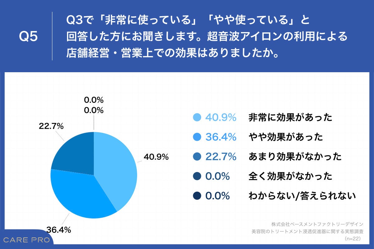 Q3で「非常に使っている」「やや使っている」と回答した方に、「Q5.超音波アイロンの利用による店舗経営・営業上での効果はありましたか。」(n=22)と質問したところ、「非常に効果があった」が40.9%、「やや効果があった」が36.4%という回答となりました。