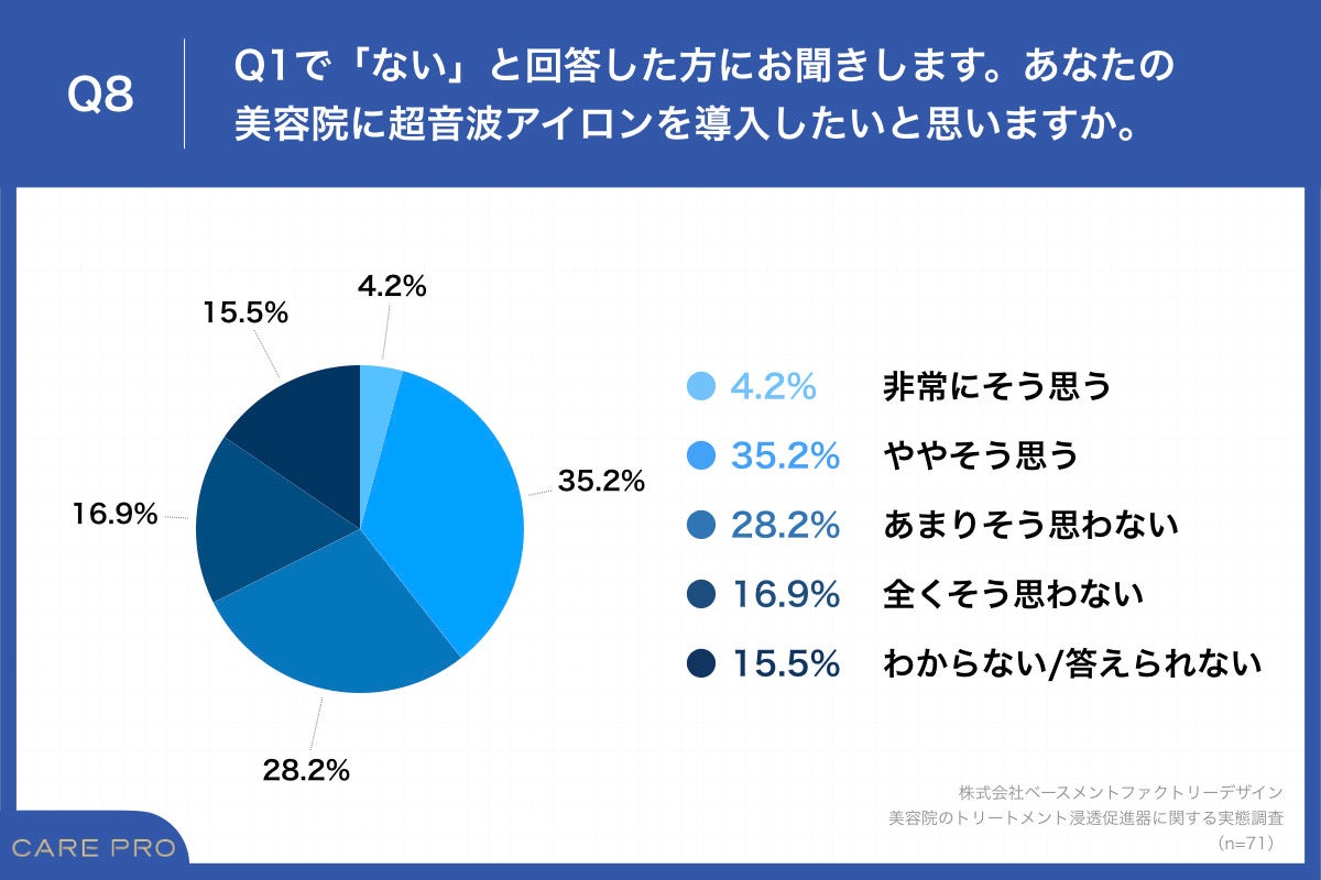 Q1で「ない」と回答した方に、「Q8.あなたの美容院に超音波アイロンを導入したいと思いますか。」(n=71)と質問したところ、「非常にそう思う」が4.2%、「ややそう思う」が35.2%という回答となりました。
