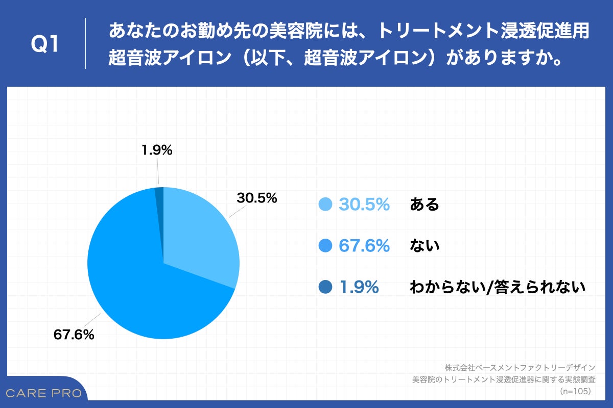 「Q1.あなたのお勤め先の美容院には、トリートメント浸透促進用 超音波アイロン(以下、超音波アイロン)がありますか。」(n=105)と質問したところ、「ある」が30.5%、「ない」が67.6%という回答となりました。