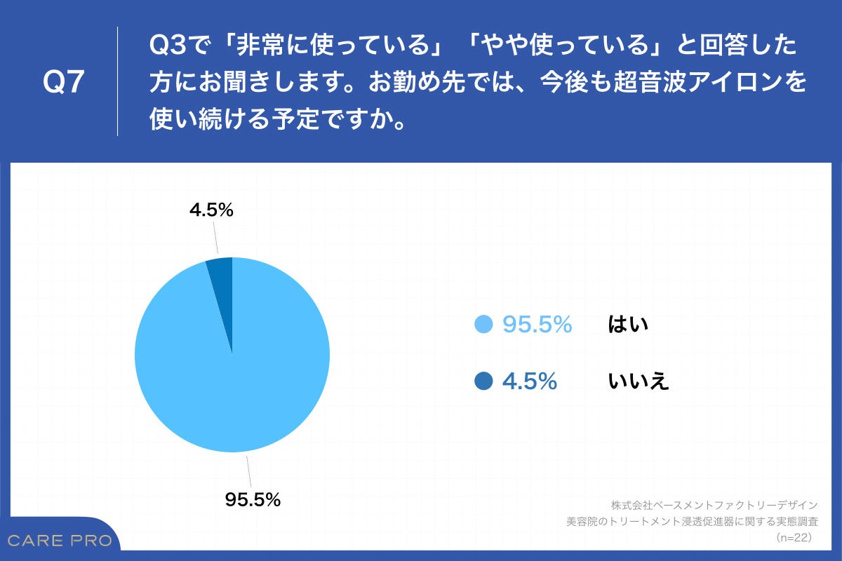 Q3で「非常に使っている」「やや使っている」と回答した方に、「Q7.お勤め先では、今後も超音波アイロンを使い続ける予定ですか。」(n=22)と質問したところ、「はい」が95.5%、「いいえ」が4.5%という回答となりました。