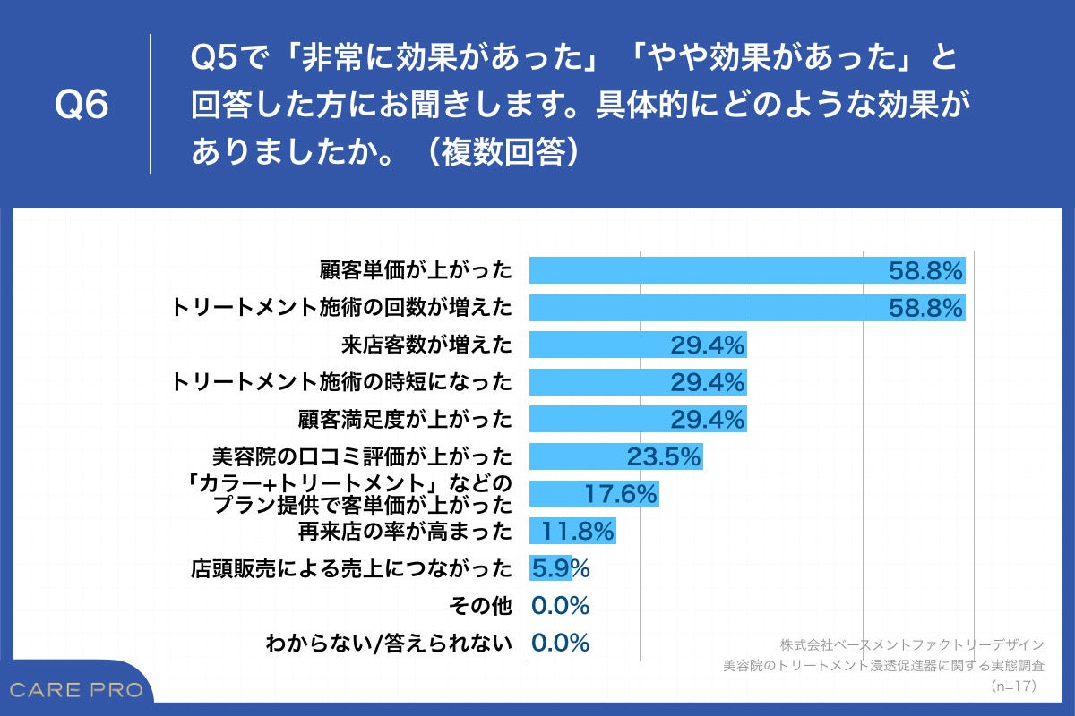 Q5で「非常に効果があった」「やや効果があった」と回答した方に、「Q6.具体的にどのような効果がありましたか。(複数回答)」(n=17)と質問したところ、「顧客単価が上がった」が58.8%、「トリートメント施術の回数が増えた」が58.8%、「来店客数が増えた」が29.4%という回答となりました。