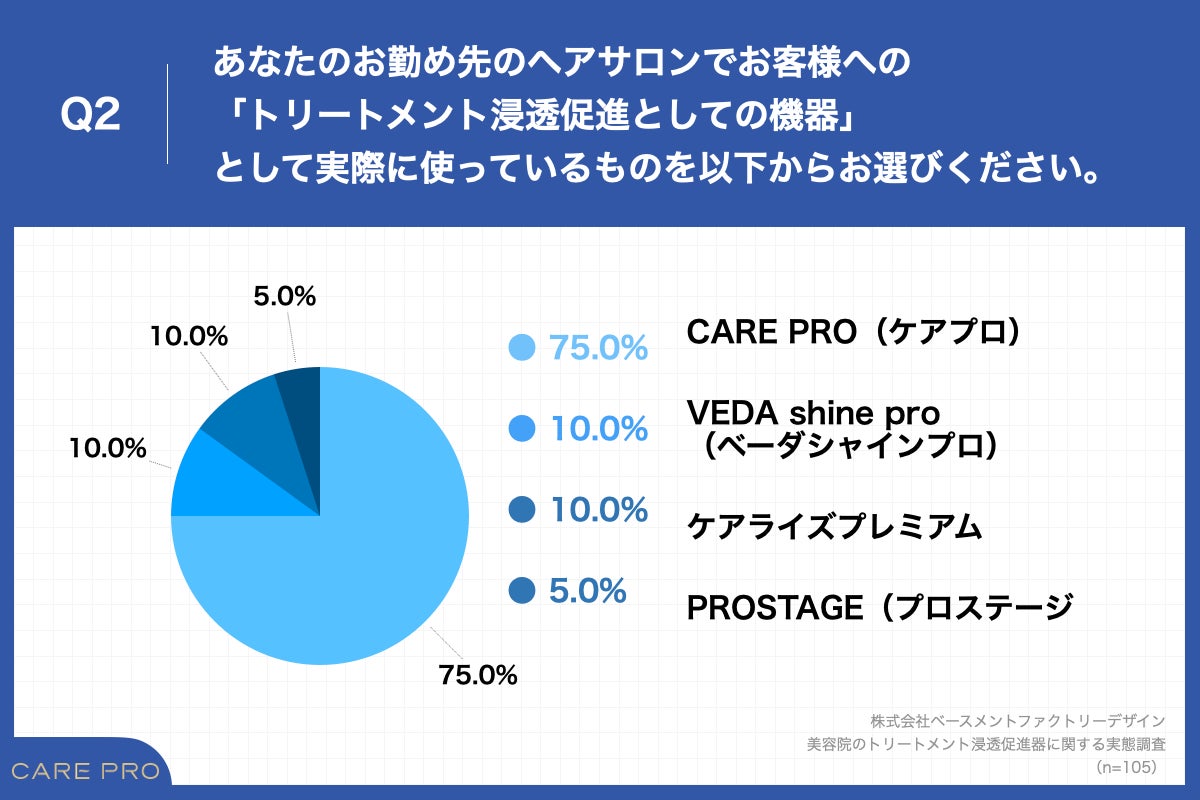 Q1で「ある」と回答した方に、「Q2.あなたのお勤め先のヘアサロンでお客様への「トリートメント浸透促進としての機器」として実際に使っているものを以下からお選びください。」(n=20)と質問したところ、「CARE PRO(ケアプロ)」が75.0%、「VEDA shine pro(ベーダシャインプロ)」が10.0%、「ケアライズプレミアム」が10.0%という回答となりました。
