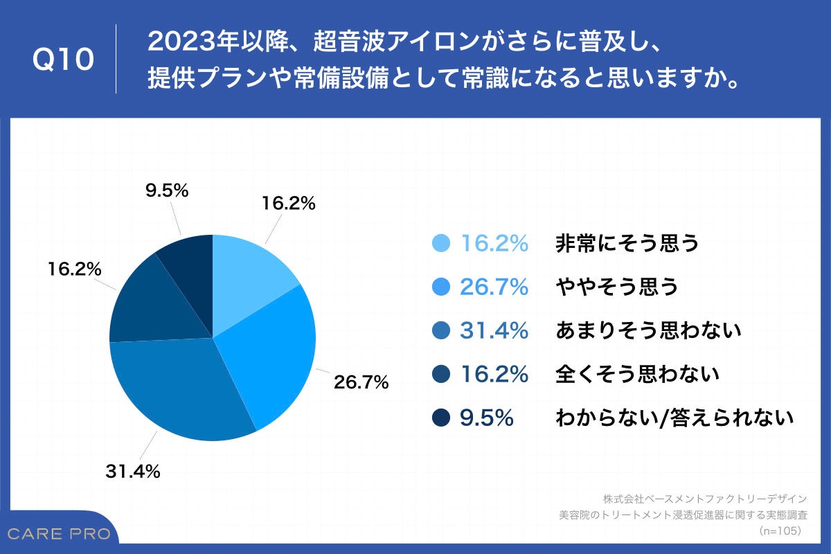 「Q10.2023年以降、超音波アイロンがさらに普及し、提供プランや常備設備として常識になると思いますか。」(n=105)と質問したところ、「非常にそう思う」が16.2%、「ややそう思う」が26.7%という回答となりました。