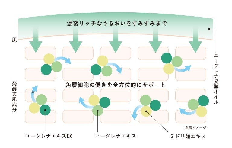 4種のユーグレナ成分※1のうち、ユーグレナ発酵オイル(エモリエント成分)※7とミドリ麹エキス(保湿成分)※8の2種は新たに研究開発された新成分で、『NEcCO (ネッコ)』が初配合になります。乱れてしまった土台※9を整える美容成分を角層のすみずみまでとどけ、柔らかにほぐします。