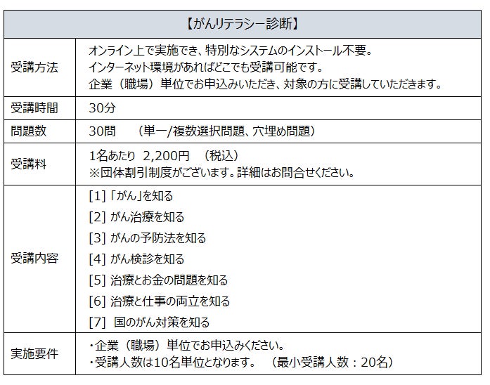 CBT(Computer-Based Test)のリーディング企業として、マイクロソフト オフィス スペシャリスト(MOS)や統計検定などのCBT試験を実施運営する株式会社オデッセイ コミュニケーションズ(本社 東京、社長 出張勝也)は、公益財団法人 日本対がん協会の新事業『働く世代のためのがんリテラシー向上プロジェクト』で相互に協力することについて2022年3月に基本合意書を締結し、本日より、がんに関する知識を企業・団体単位で把握するためのオンラインテスト「がんリテラシー診断」を開始します。
