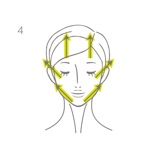 4.小指の側面を小鼻にあて、手のひらで頬を包みながら、ほうれい線を引き上げるイメージでお顔を持ち上げます。手のひらで頬から目の周りまでを包みながら、外側に向かって引き上げます。額を両手で包み、髪の生え際に向かって引き上げます。