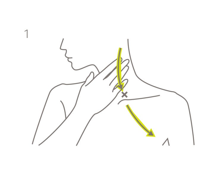 1.首を横に向け、指全体を使って、耳の下からX印に向かって流します。左右両側行ないます。