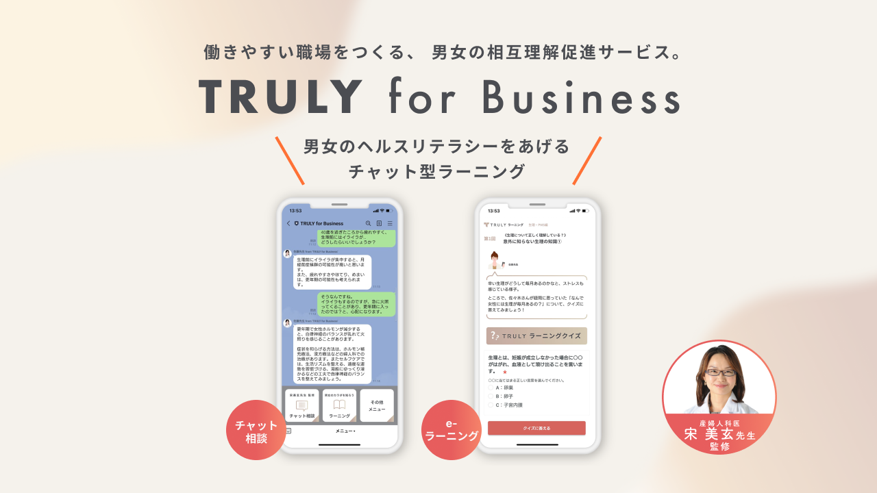 TRULY for Businessは、企業の全従業員の生産性を上げる「ホルモンケア・ヘルスリテラシー」向上ソリューションです。