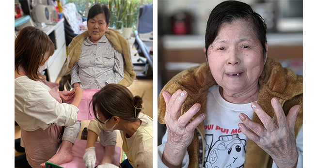 コロナ禍での卒業課題の実施が難しくなり、「だったら、私の母に施術してもらえませんか?」というお話をして、施術していただきました。始まってから驚いたのは、娘の私でも知らないような情報をケアビューティストの皆さんが引き出していたり、家で寝て過ごすことが多かった母が、化粧やネイルをしていただくことで、女性らしさを取り戻したように見え、とても感動しました。また、介護保険内のサービスではどうしても決まった時間の中で多くの事をこなすため、一人ひとりに向き合ったサービス提供というものが難しいものですが、介護美容は保険外サービスということもあり、決まった時間の中でも、きめ細やかな対応もしていただけますし、社会参加の一つにもなると考えています。