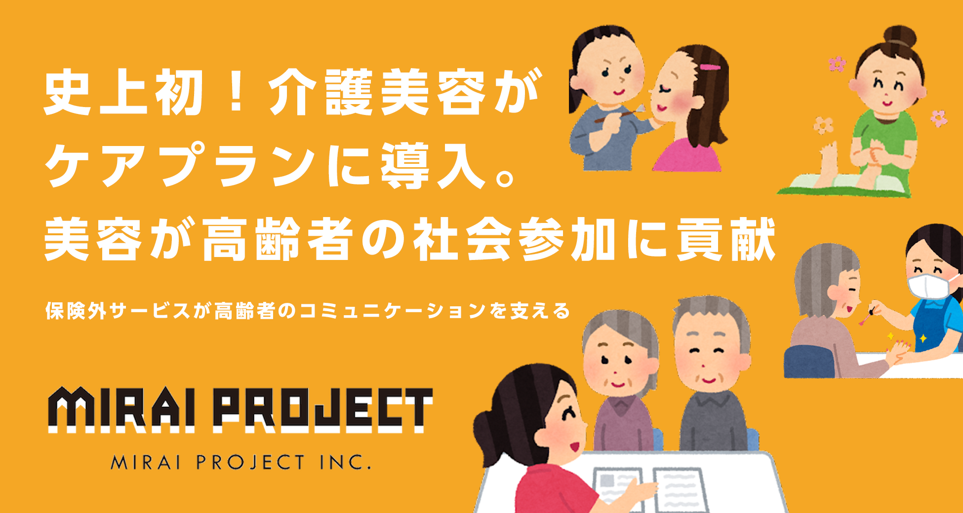 日本初の介護美容専門スクール【介護美容研究所】を運営する、株式会社ミライプロジェクト(代表取締役:山際 聡 以下、当社)は、これまで施設や個人宅で行ってきたサービスを本格的にケアプランの一つとして導入するプロジェクトを1月より開始しました。これを機会に、より多くの方に介護美容を知っていただき、これからも高齢者の皆様のQOL向上を目指します。