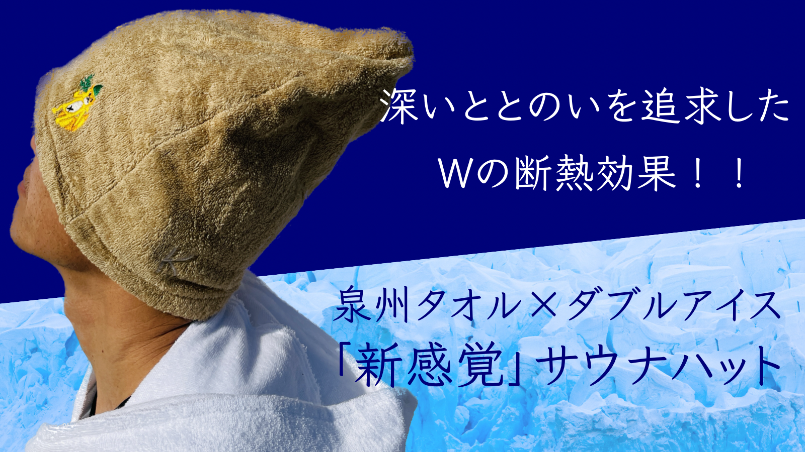 新感覚サウナハットは表生地に泉州のツバメタオルさんのタオルを使用。裏生地には接触冷感生地のダブルアイスを使用する事で被った瞬間のひんやりかんとしっかりとした断熱効果を実現しました。