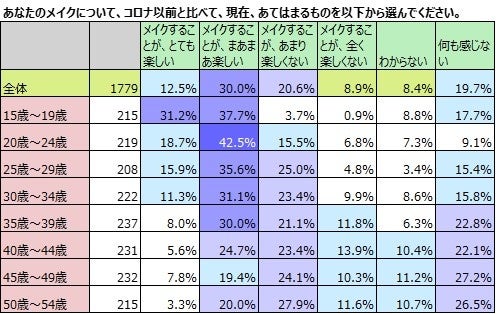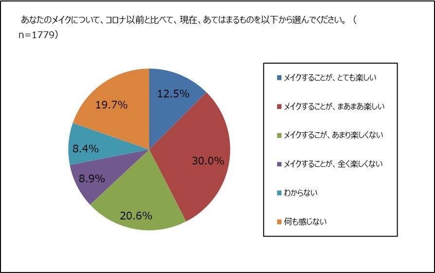 日常的にメイクをしている女性、1,779名に、コロナ前と比べて、現在、メイクをすることが楽しいか否か聞きました。マスク着用の常態化が続く中、以前のようにメイクを人に見せることが少ない状態が続いていますが、「とても楽しい」女性は12.5%、「まあまあ楽しい」女性は30%で、合わせると42.5%の女性が、この状況下でも、以前よりも現在、メイクが楽しいと答えています。「あまり楽しく感じない」「何も感じない」女性はともに約2割、「全く楽しくない」「わからない」女性はともに1割弱です。