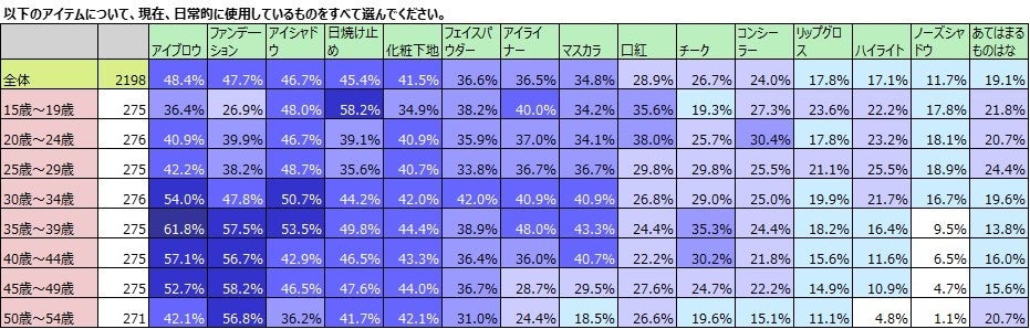 調査の結果から、最も日常的に使用されているアイテムは、「アイブロウ」で48.4%。僅差で続くのが、「ファンデーション」47.7%、「アイシャドウ」46.7%でしたが、いずれも5割を切っています。「アイブロウ」の使用者は2019年調査で80.5%、2021年調査で76%、「ファンデーション」は、2019年調査で88.5%、2021年調査で78.7%だったため、ともに激減していると言えます。また、「ファンデ―ション」は、2019年調査と2021年調査において最も多く使用されているアイテムでしたが、今回の調査の1位は「アイブロウ」になりました。