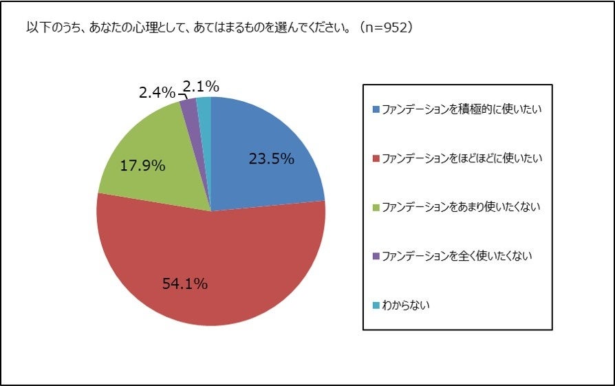 最後に、ファンデーションを日常的に使用している人に、使用する心理としてあてはまるものを選んでもらいました。ファンデーションを使用しながらも、「ファンデーションをあまり使用したくない」17.9%と「全く使用したくない」2.4%を合わせると20.3%になり、2割を超える女性が、ファンデーションを使用していながら、ファンデーションの使用には積極的でないことがわかりました。今回の調査においては、ファンデーション離れが進んでいる一方で、人に見られていなくてもファンデーションを使用する層もやはり根強く存在することがわかりました。