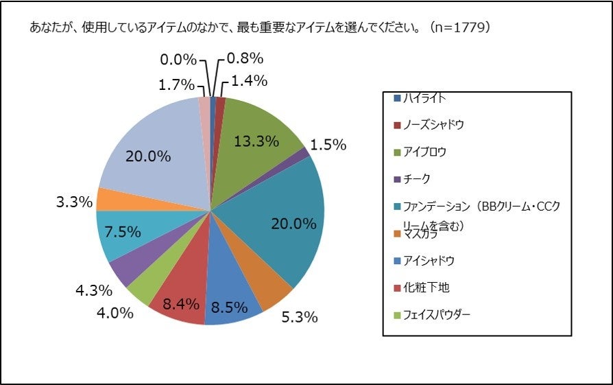 使用しているアイテムの中で、最も重要なアイテム1品を選んでもらいました。1位は同率で、「日焼け止め」と「ファンデーション」で、ちょうど20%でした。「アイブロウ」が13.3%で続きますが、それ以外のアイテムはすべて10%未満になりました。