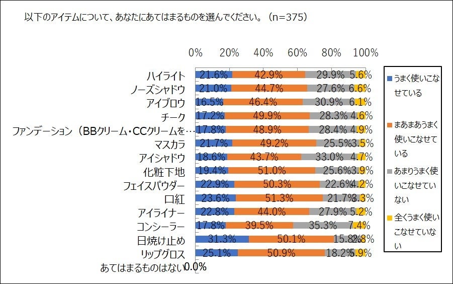 最もうまく使いこなせているのは、「日焼け止め」。「まあまあうまく使いこなせている」を合わせると81.4%と8割以上が使いこなせている。