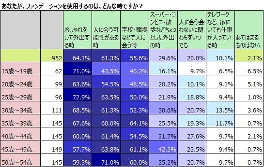 日常的にファンデーションを使用していると答えた15歳~54歳の女性952名に、ファンデーションの使用頻度を聞きました。毎日使用している女性は、39.6%と約4割で、15歳~24歳の若年層が少なく、25歳以降の世代になるとだいたい4割です。(表:下部)また、ファンデーションを使用するシチュエーションを聞くと、最も多いのは、「おしゃれをして外出する時」で64.1%。比較的若年層の方が多い割合です。ファンデーションの使用割合は、高齢層の方が高いため、「おしゃれをして外出する時」・「テレワークなどで家にいても仕事が入っている時」以外は、年齢が高くなるほど、多くのシチュエーションでファンデーションを使用しています。「人に会う・会わないに関わらずいつでも」を選択した女性も2割存在し、人のためのメイクでなく、自分のためにファンデーションを使用している女性の割合も一定に存在します。