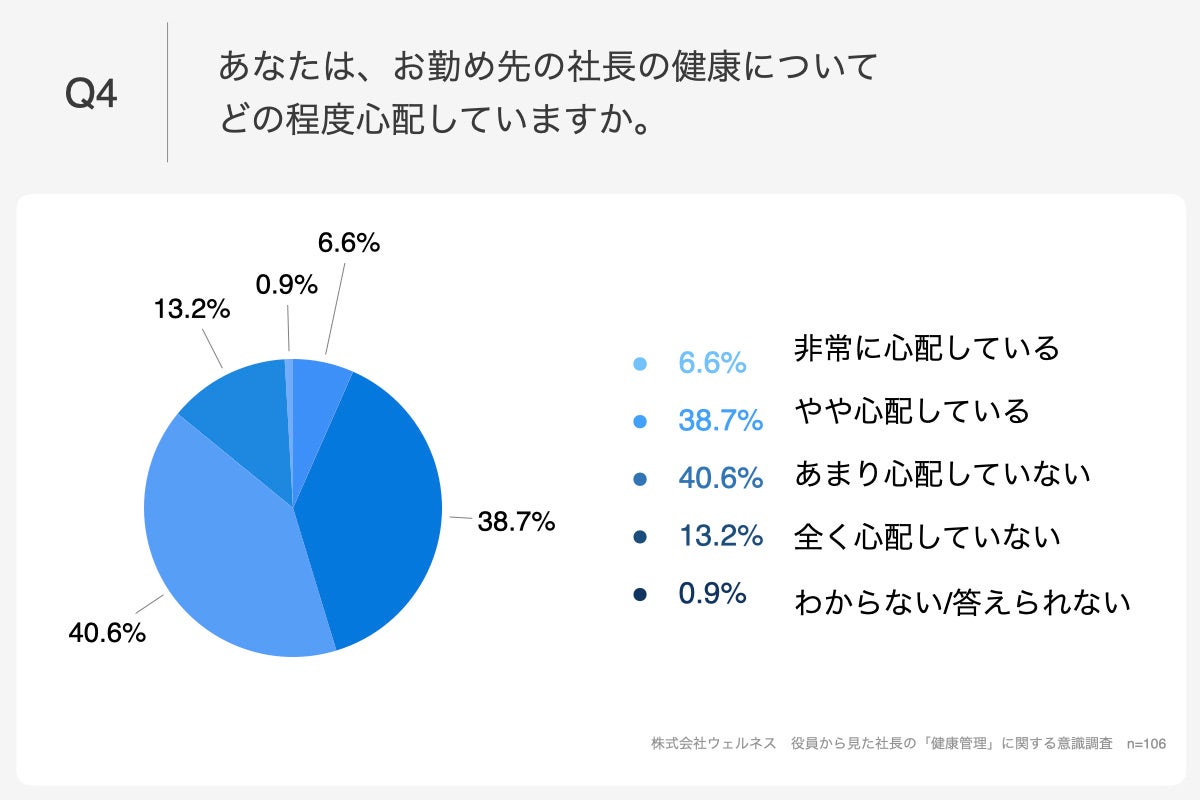 「Q4.あなたは、お勤め先の社長の健康についてどの程度心配していますか。」(n=106)と質問したところ、「非常に心配している」が6.6%、「やや心配している」が38.7%という回答となりました。