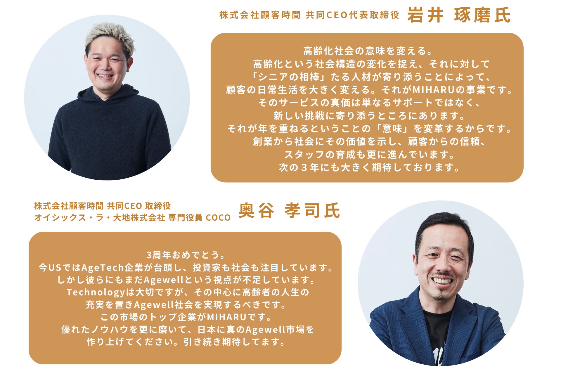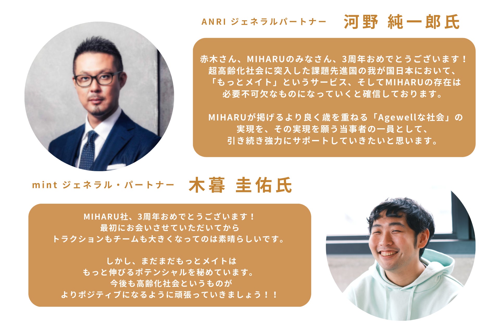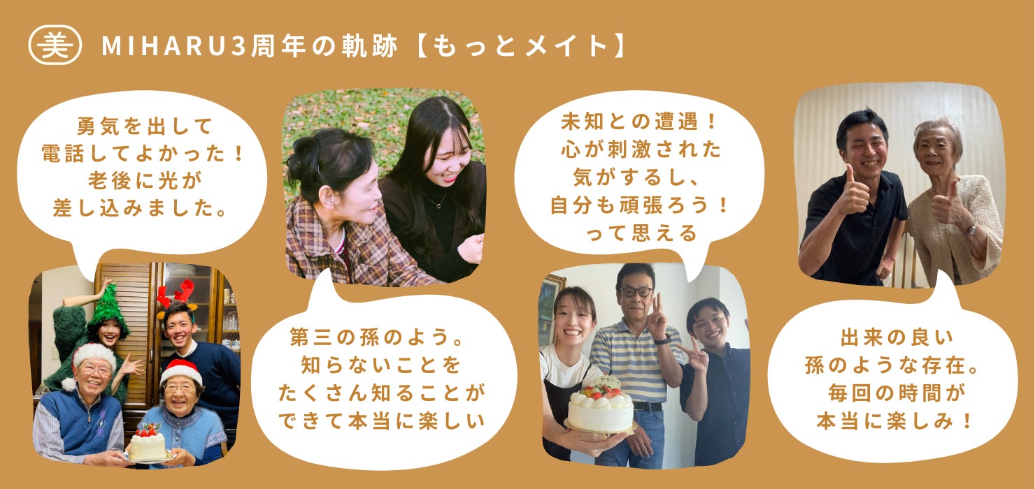 シニア世代のウェルビーイングを実現する孫世代の相棒サービス「もっとメイト(以下、もっとメイト)」を運営する株式会社MIHARU(本社:東京都渋谷区、代表取締役:赤木円香、以下MIHARU)は、2023年1月10日で創業3周年目を迎えました。株式会社MIHARUの3周年を記念し、みなさまへの感謝をお伝えするとともにこれまでの実績や成長をまとめたデータを公開いたします。