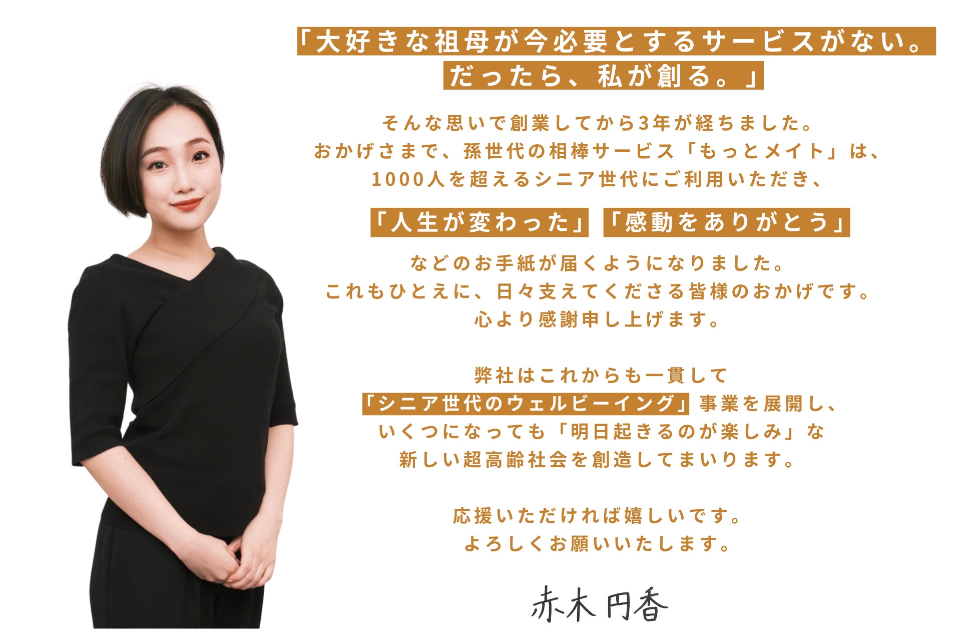 もっとメイトの利用継続月数は非常に長く、最も長期的にご利用いただいているお客様は2年半の期間継続していただいております。ご利用いただいているお客さまからは、「老後に光が差し込んだ!」「第三の孫のような存在」と喜びの数々をいただいてまいりました。こうしたサービスの特徴や声をより明確にみなさんにお伝えしていきたいと考えております。
